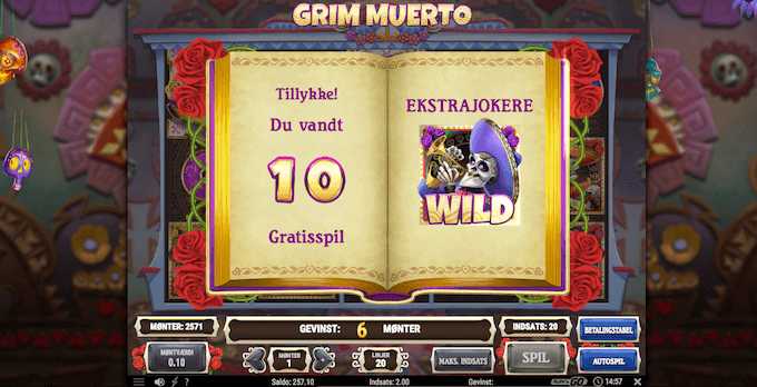 Hvis det lykkedes dig at få tre af ”de dødes bog” symboler på hjulene, vil det udløse 10 free spins. Det er muligt at få endnu flere free spins ved at ramme en eller to lysestager scatter symboler. Du vil modtage 3 eller 6 free spins. Free spins er uden tvivl vejen frem i Grim Muerto. Det er det generelt set på spillemaskiner, men på spillemaskinen Grim Muerto føles free spins som at være en lang størrre del af spillet end andre spillemasiner. Det er desuden altid rart at have en bonusrunde, hvor man har mulighed for at vælge, istedet for kun at holde øje og krydse fingre.